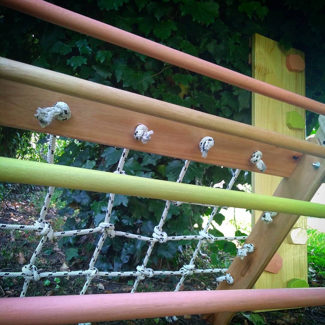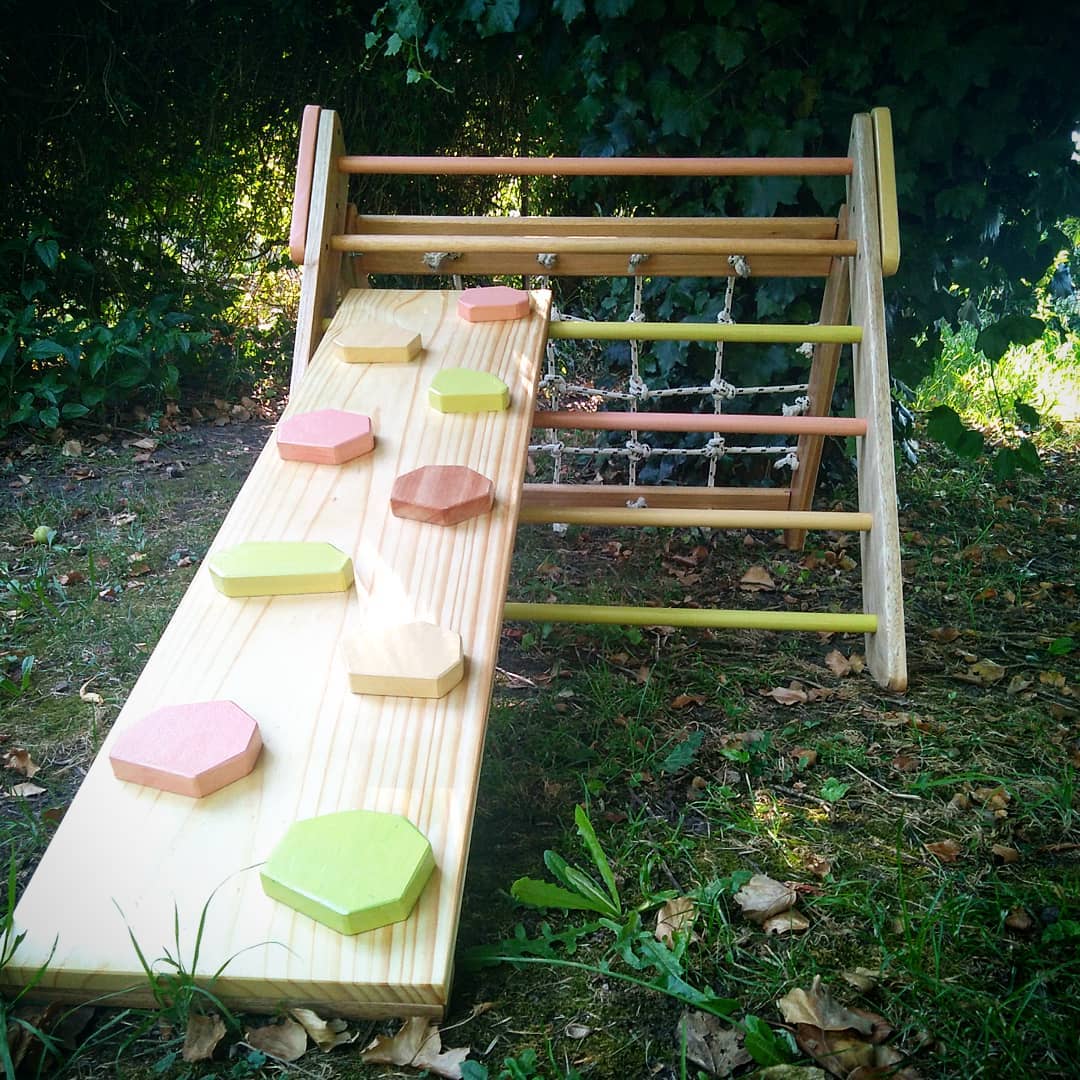 Cuenta con 6 barrotes en uno de sus laterales y una red del otro para estimular diferentes formas de trepar. Es acompañado por una rampa que puede colocarse a diferentes alturas. La rampa cuenta con encastres para facilitar su recorrido de un lado y colocada del lado opuesto funciona como tobogán. Modelo plegable para facilitar el guardado.